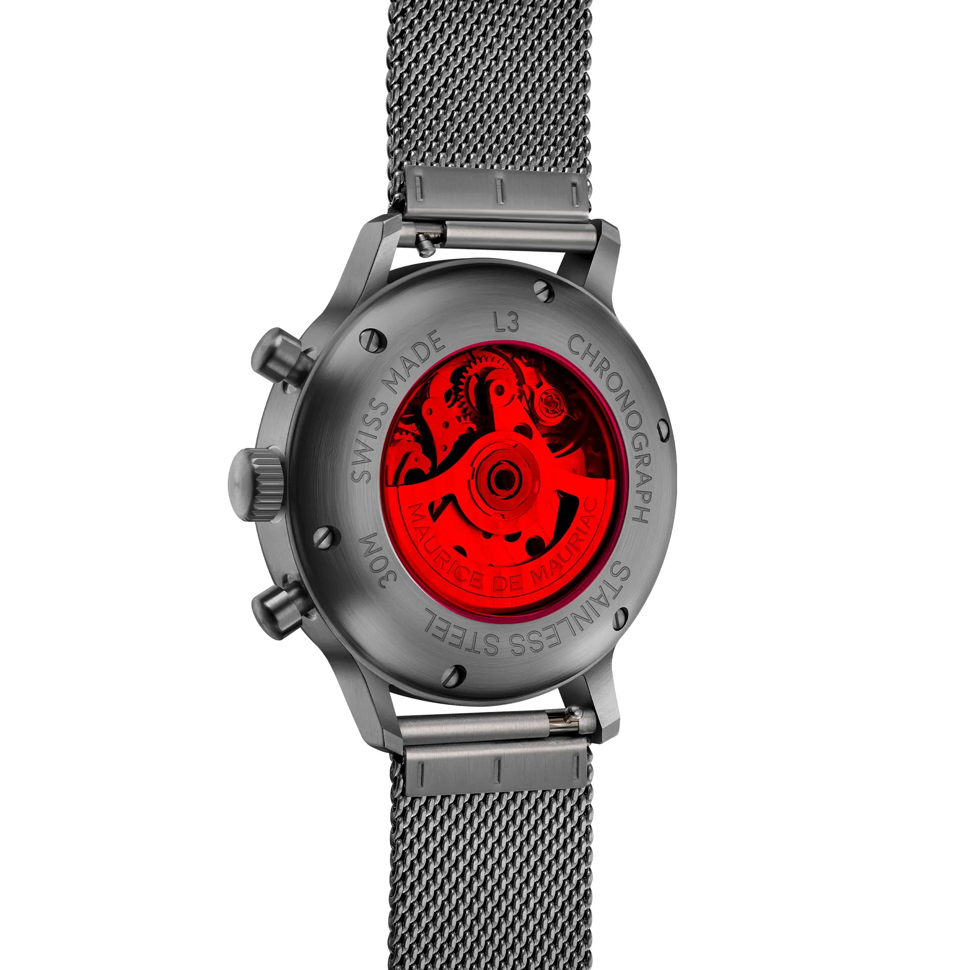 “The horizontal tri-compax layout, very popular among watch collectors, has on Schwaerzler’s work desk been reduced to lines – the raison d’être for the L series. “In design it is much harder to take away than to add. And you should not take away just for the sake of reduction, but to improve the function and the aesthetics”